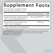 Sports Research Vitamin D3 + K2, 120 softgels - Plant Based K2 & Vegan D3 5000iu with Coconut MCT Oil - Vegan Certified, Soy & Gluten Free