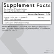 Sports Research Vitamin K2 MK7 180mcg with Coconut Oil, 60 Veggie softgels - Vegan Certified, Non-GMO Verified & Gluten-Free