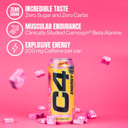- C4 Energy's incredible taste is made with no sugar, calories, artificial flavors or compromises on taste. With 200mg of caffeine and proven ingredients like Carnosyn Beta-Alanine and BetaPower Betaine, Experience explosive energy, hydration and endurance.
