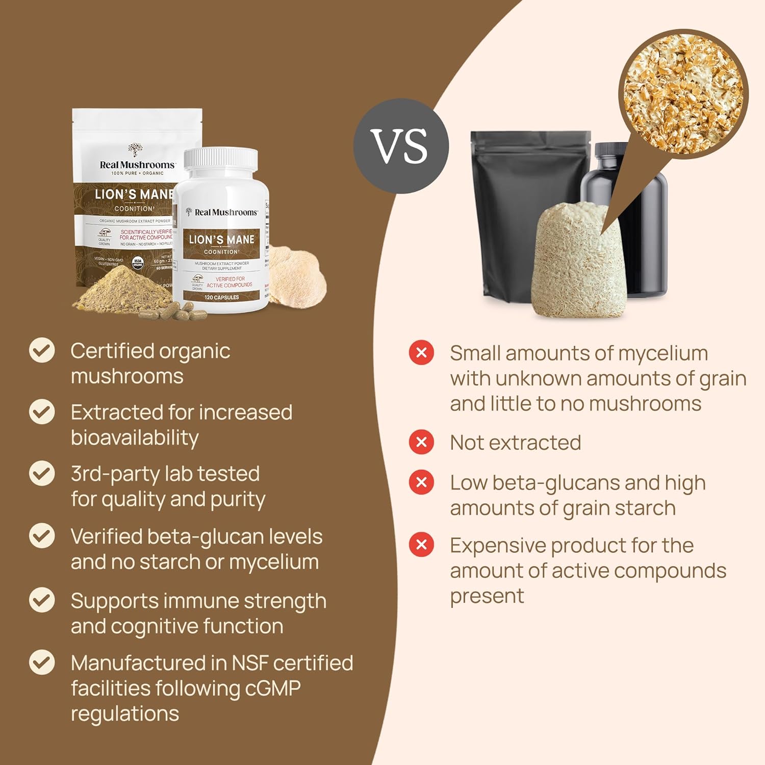 Organic Extract: We use 100% mushroom fruiting bodies, not mycelium grown on grain, ensuring no starch, grains, or mycelium in our capsules.