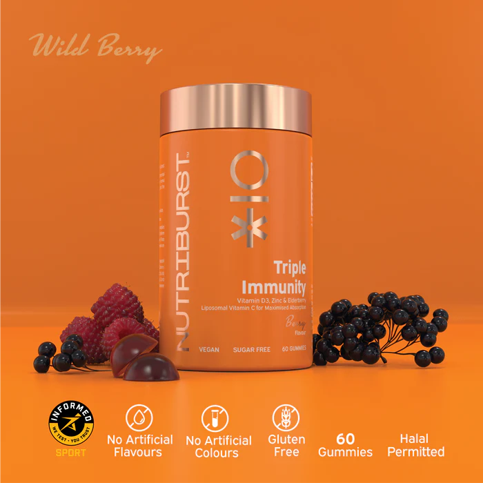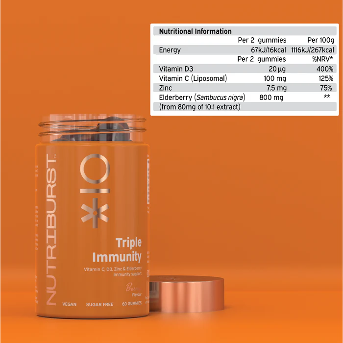 - Nutriburst's Triple Immunity gummies combine Vitamin C, Vitamin D3, Zinc, and Elderberry Extract to support optimal immune system function and overall well-being.