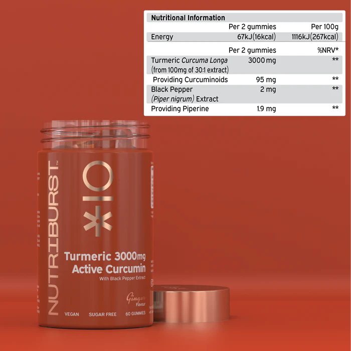 Nutriburst Turmeric 3000mg Active Curcuminoids with Black Pepper Extract, Vegan, Sugar Free, 60 Ginger gummies