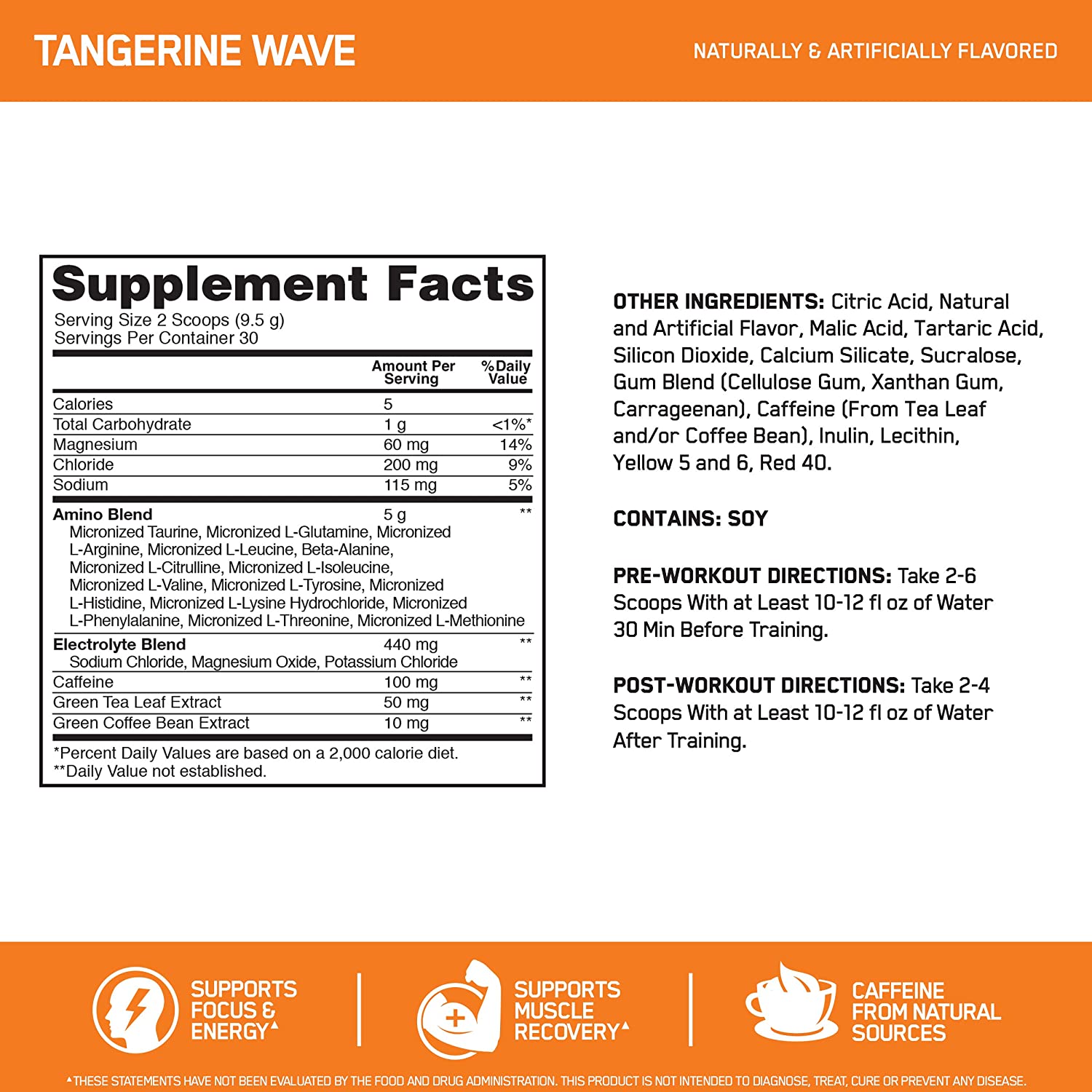- Each serving provides 100mg of caffeine from natural sources to support energy and focus, as well as 5 grams of amino acids to support muscle recovery, plus electrolytes to help replace what’s lost through sweat.