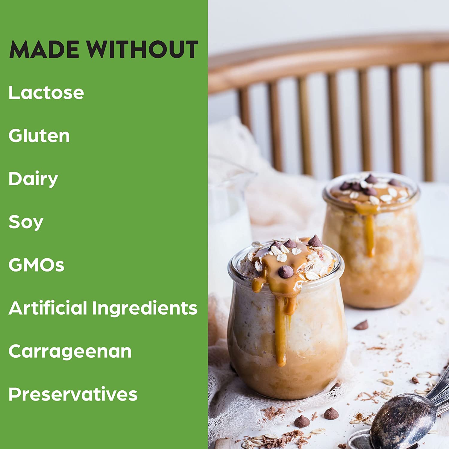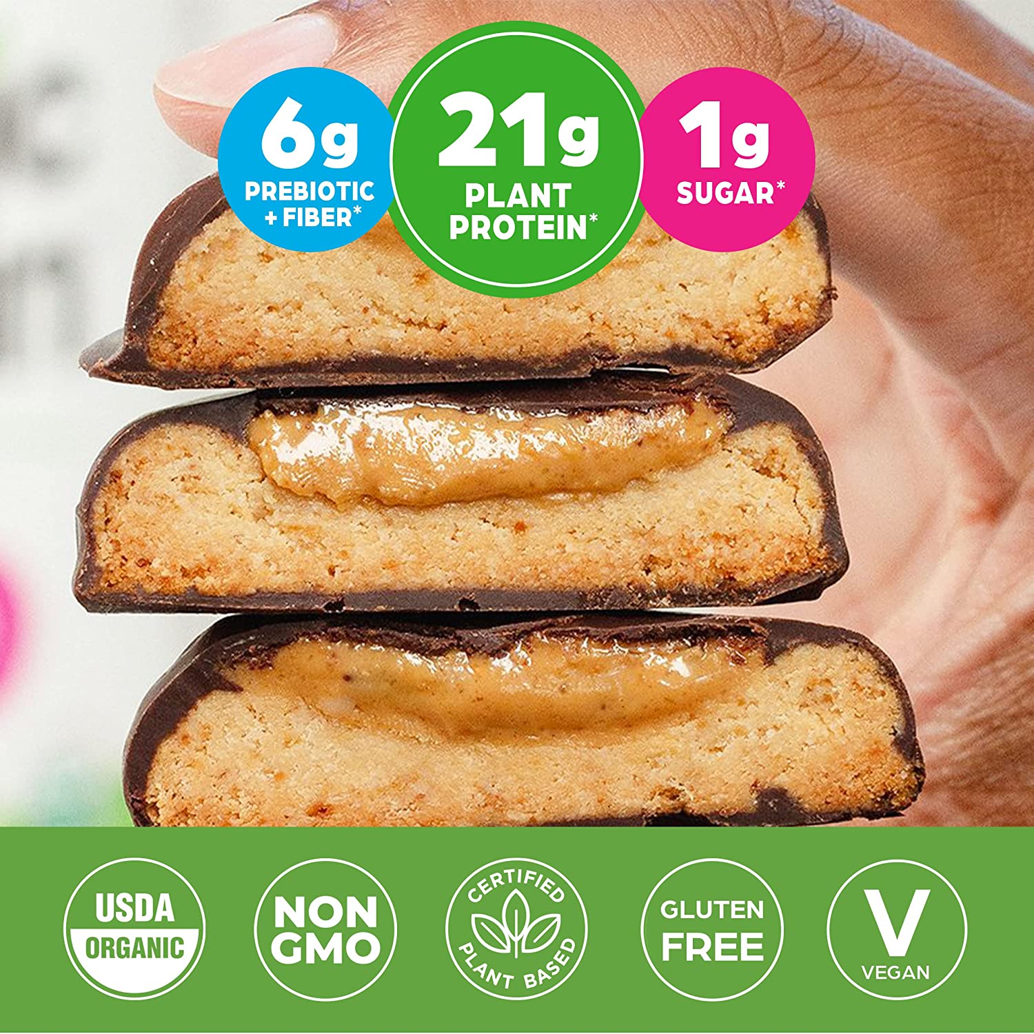 - 21 grams of organic plant protein (peas, brown rice, chia seeds), 2 grams of organic fiber, low starch, 0 grams of added sugars, 150 calories per serving.