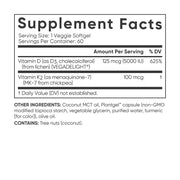 - 100% plant-based vitamin D with vitamin K is certified vegan, non-GMO, and free of soy, gluten, gelatin and Carrageenan - all made with cold-pressed organic virgin coconut oil.